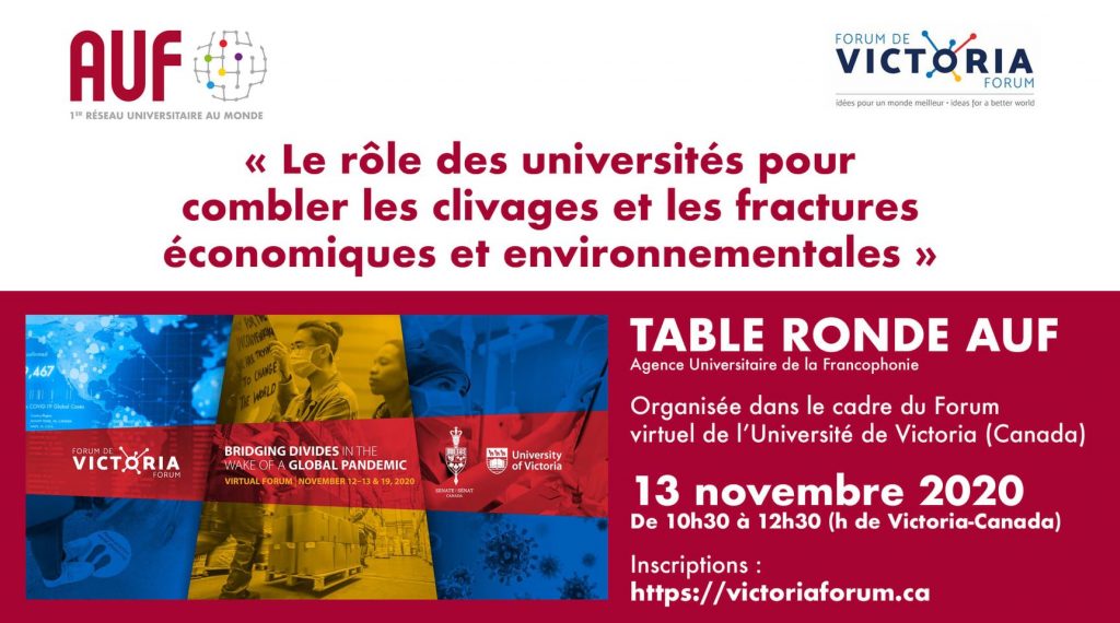 TABLE RONDE #AUF : « Le rôle des universités pour combler les clivages et les fractures économiques et environnementales , le 13 novembre 2020, de 10h30 à 12h30 (heure de Victoria-Canada)