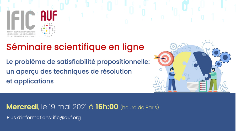 Dans le cadre des activités du réseau RIFIRO (Réseau International Francophone pour l'Innovation, la Recherche et la science Ouverte), l’Institut de la Francophonie pour l'Ingénierie de la Connaissance et la formation à distance (IFIC) et L’institut national de recherche en sciences et technologies du numérique (INRIA) avec ses partenaires du LIRIMA, organisent un séminaire scientifique en ligne sur le thème « Le problème de satisfiabilité propositionnelle : un aperçu des techniques de résolution et applications » .