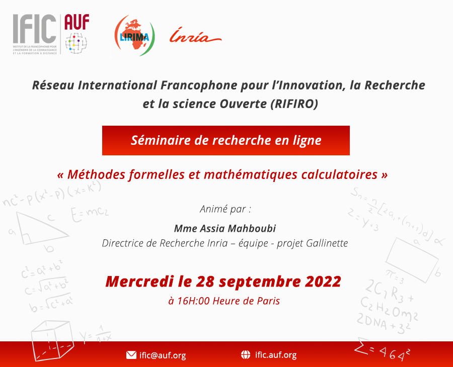 L’IFIC vous invite dans le cadre des activités du réseau RIFIRO à participer gratuitement au séminaire de recherche en ligne sur le thème « Méthodes formelles et mathématiques calculatoires ».
