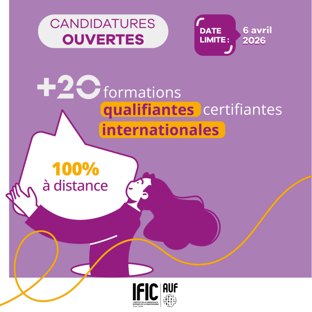 L’Agence universitaire de la Francophonie (AUF), à travers son Institut de la Formation à Distance de la Francophonie (IFIC), lance son Appel à candidatures – Mars 2026 pour des formations qualifiantes certifiantes internationales entièrement à distance.