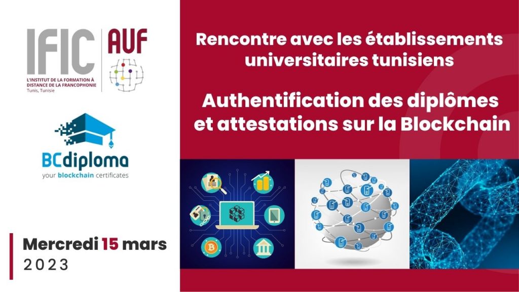 L’IFIC, l’Institut de la formation à distance de la Francophonie, a organisé le 15 mars 2023 au sein de ses locaux une rencontre d’information sur l’authentification des diplômes et attestations sur la Blockchain, destinée aux universités tunisiennes membres de l’AUF.